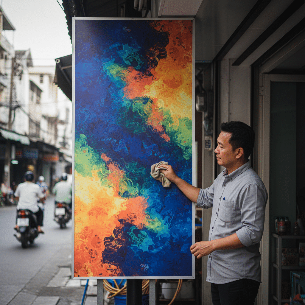 - เทคนิคการพิมพ์และการป้องกันผิว: การใช้หมึกพิมพ์ Eco-Solvent ที่ทนต่อรังสี UV และการเคลือบผิว (Lamination) เป็นขั้นตอนสำคัญในการปกป้องสีสันไม่ให้ซีดจางและป้องกันความเสียหายทางกายภาพ