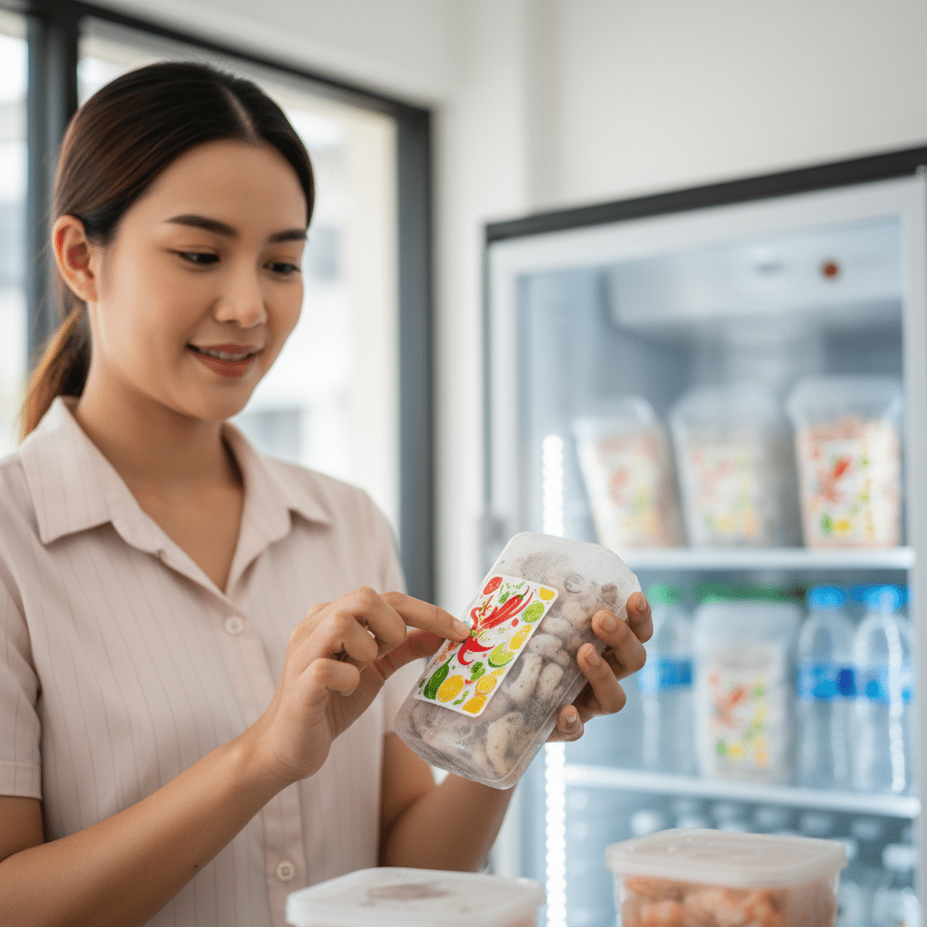 ติดสติ๊กเกอร์ก่อนนำไปแช่แข็งเสมอ นี่คือกฎเหล็กที่ต้องยึดถือ การพยายามติดสติ๊กเกอร์ลงบนบรรจุภัณฑ์ที่เย็นจัดหรือมีเกล็ดน้ำแข็งเกาะอยู่แล้วแทบจะเป็นไปไม่ได้ที่สติ๊กเกอร์จะยึดติดได้ดี ควรติดฉลากให้เรียบร้อยในขั้นตอนการบรรจุสินค้า จากนั้นรีดสติ๊กเกอร์ให้เรียบสนิทกับพื้นผิวเพื่อไล่ฟองอากาศออกให้หมด แล้วจึงนำสินค้าเข้าสู่กระบวนการแช่เย็นหรือแช่แข็งต่อไป